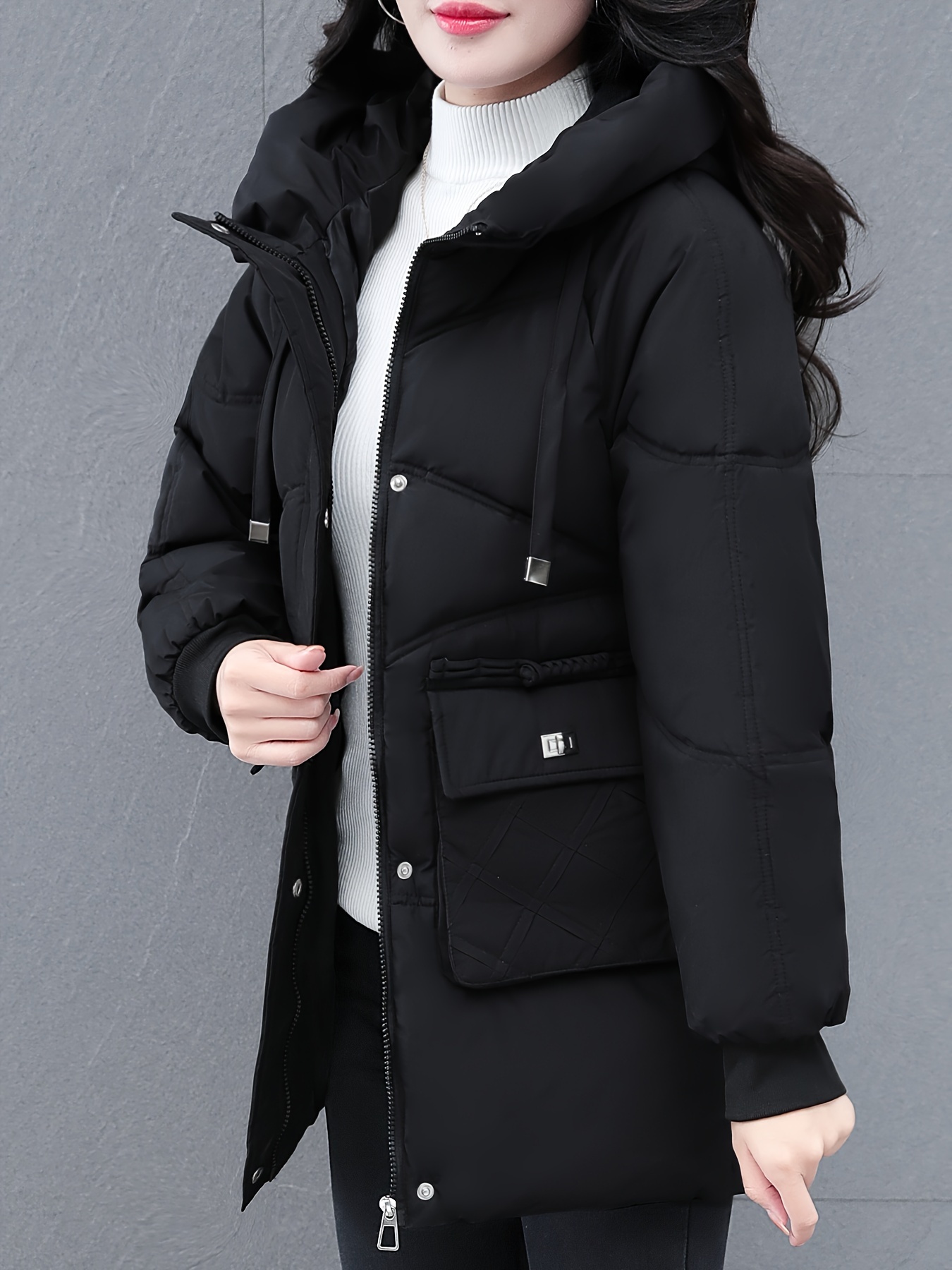 1pc Winter Women'S Casual Hooded Coat, Thickened Cotton Jacket with Zipper, Solid Color Polyester Non-Stretch Regular Length Outerwear