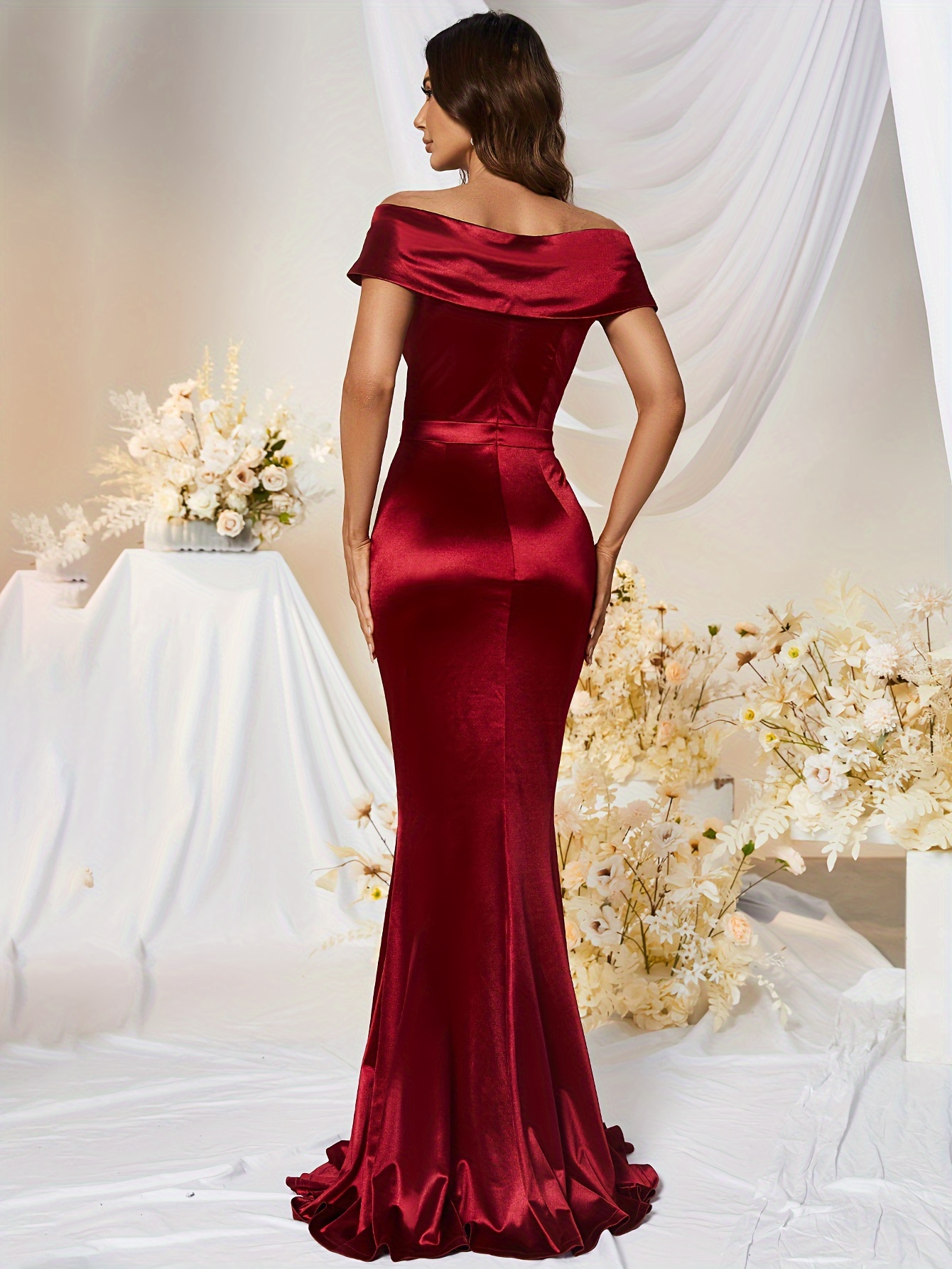 1pc MUXXN Elegant Satin Mermaid Gown for Women - Off the Shoulder Cap Sleeve Bodycon Floor-Length Dress, Solid Color Knit Fabric, All-Season Bodycon for Wedding Bridesmaid