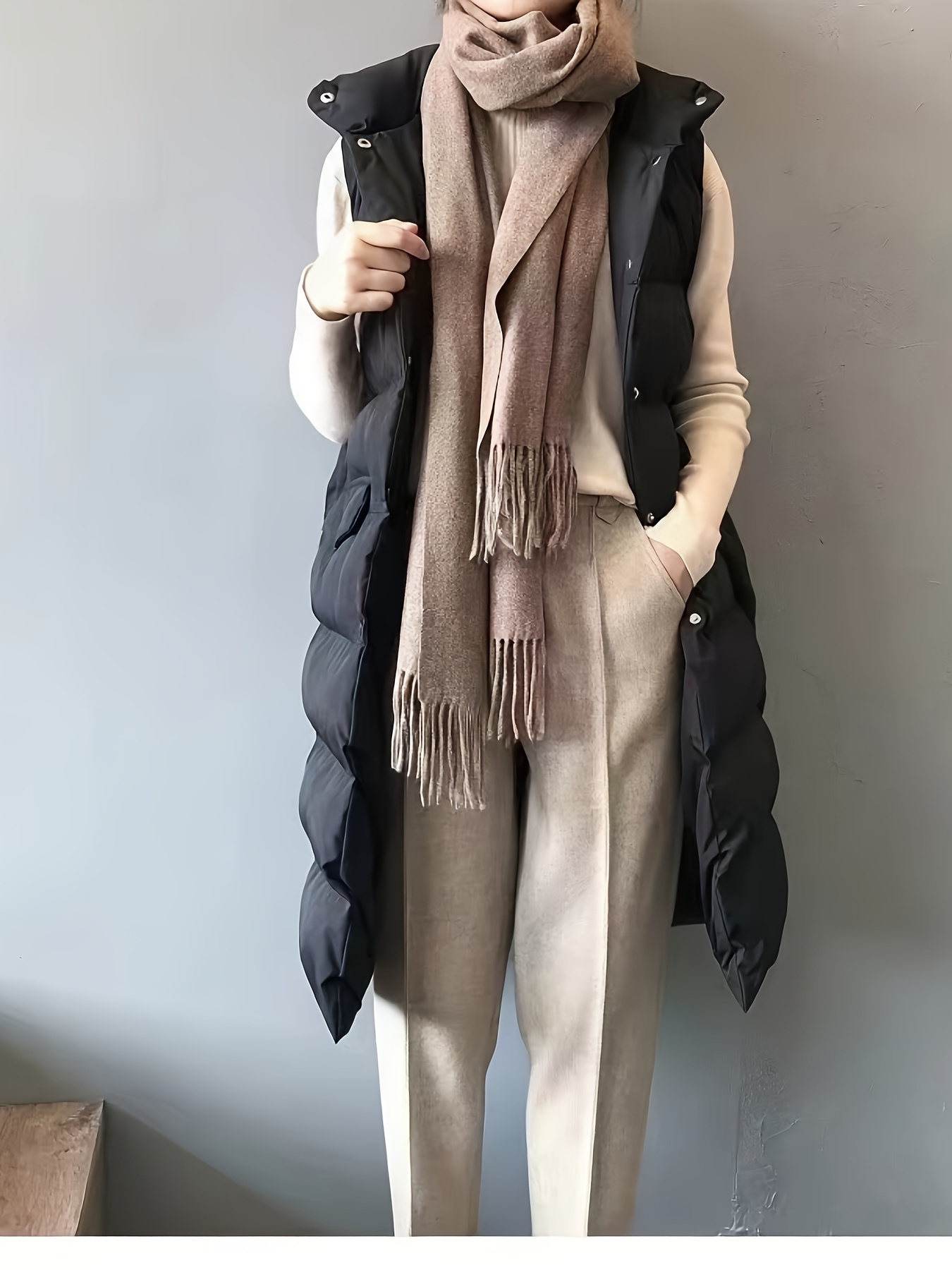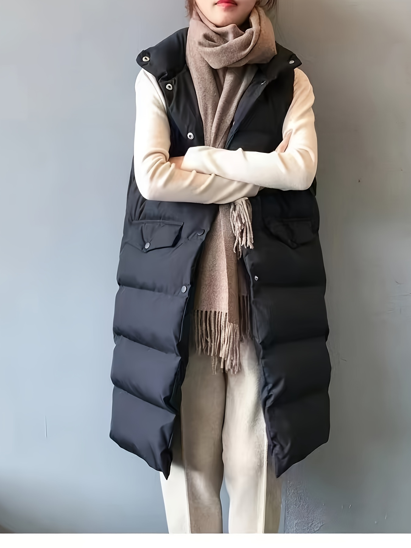 Plus Size Women's Puffer Vest - Casual Solid Color Front Button Down Design, Includes Scarf for Winter, Cozy and Warm