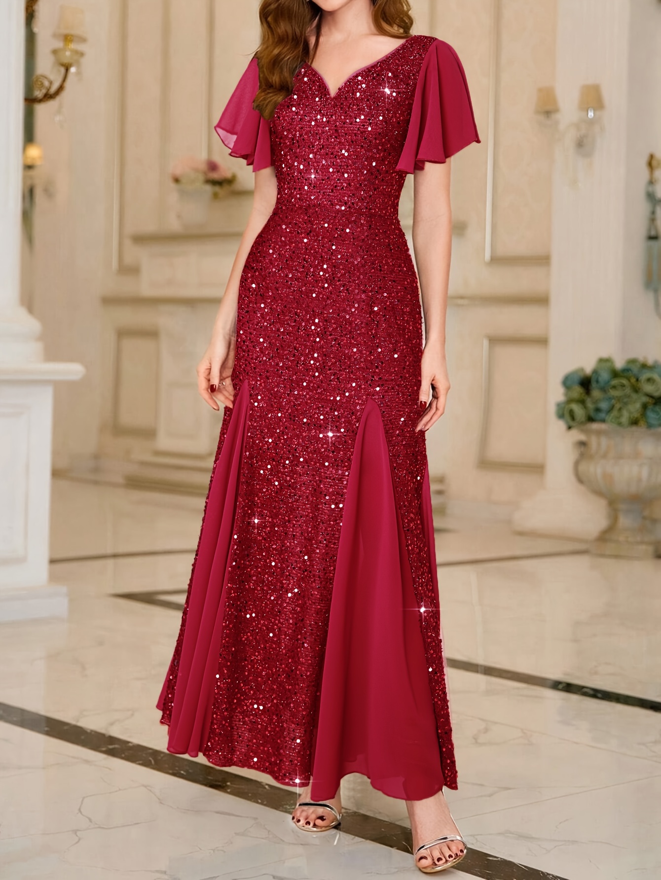 Elegant Sequin Sweetheart Neck Maxi Dress - Bodycon Fit, Micro Elastic Polyester, Puff Sleeves, Solid Color, Hand Wash - Perfect for Party & Banquet, Womens Clothing