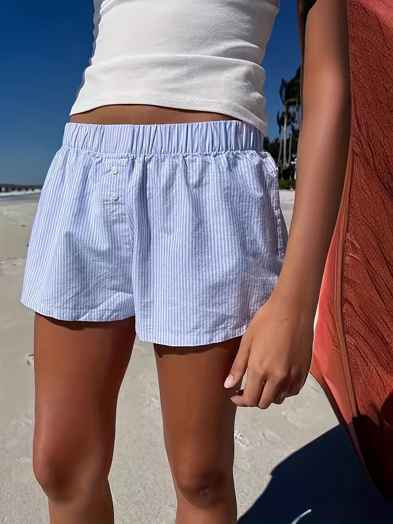 Stripe Print Elastic Waist Shorts, Casual Button Decor Shorts For Summer & Spring, Women's Clothing