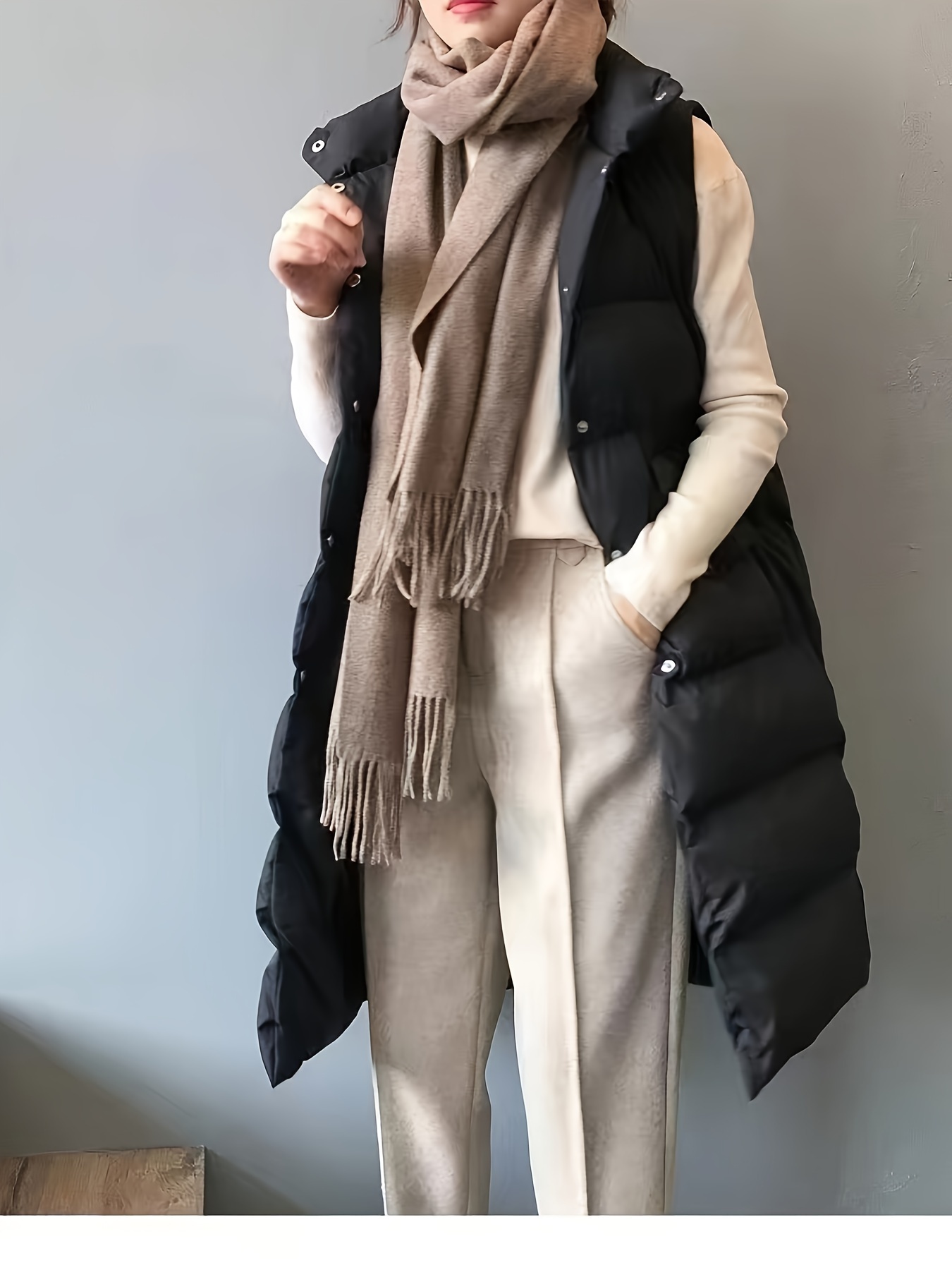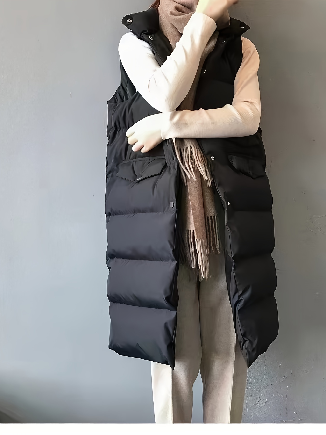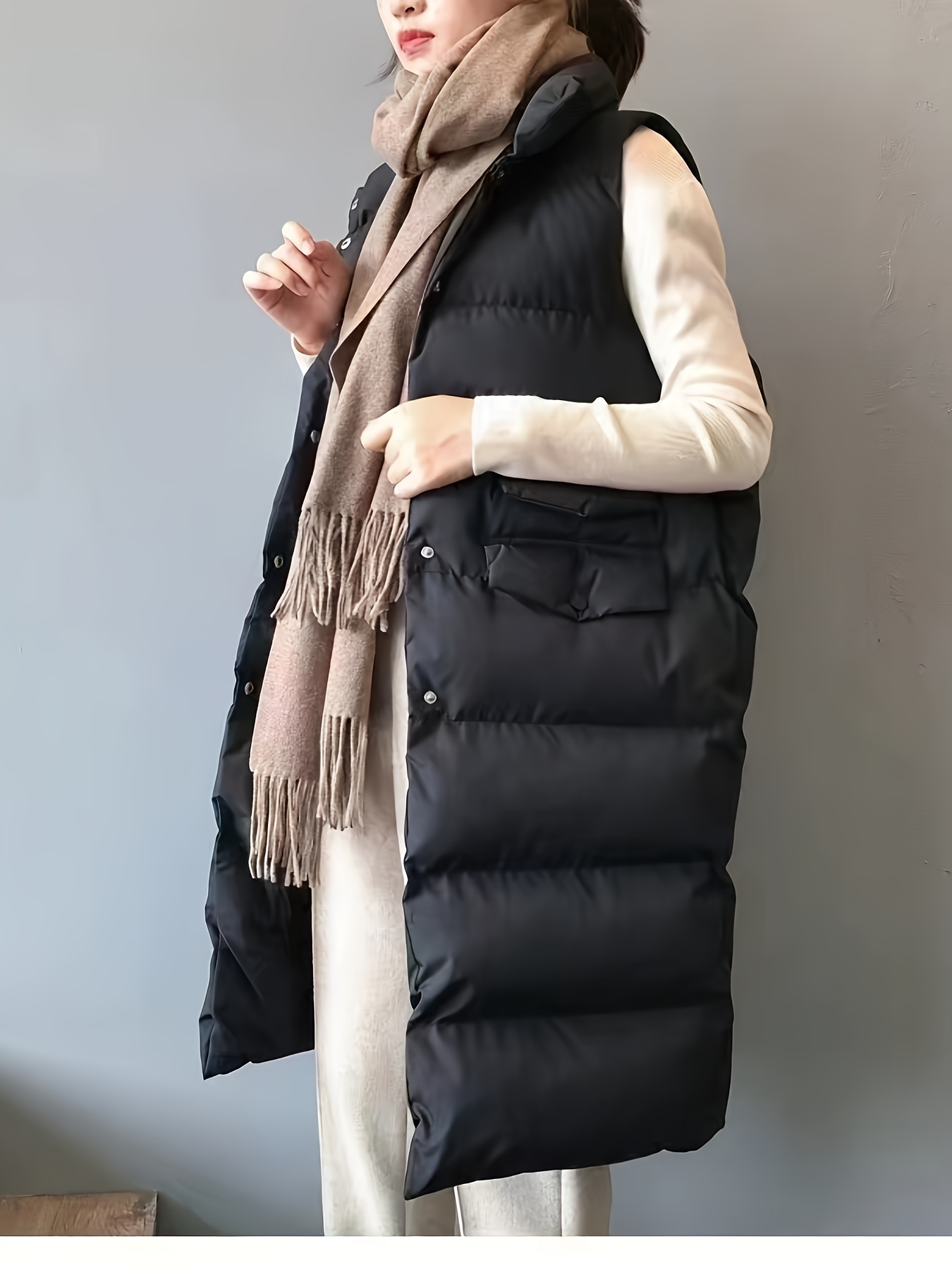 Plus Size Women's Puffer Vest - Casual Solid Color Front Button Down Design, Includes Scarf for Winter, Cozy and Warm