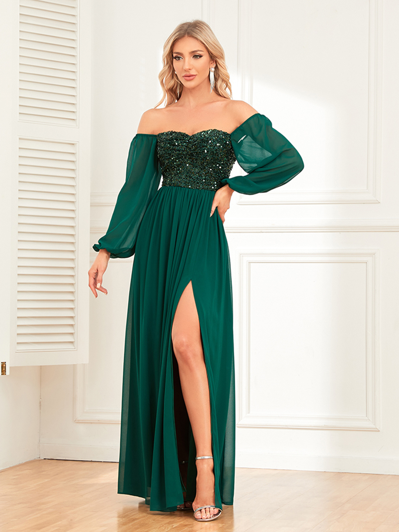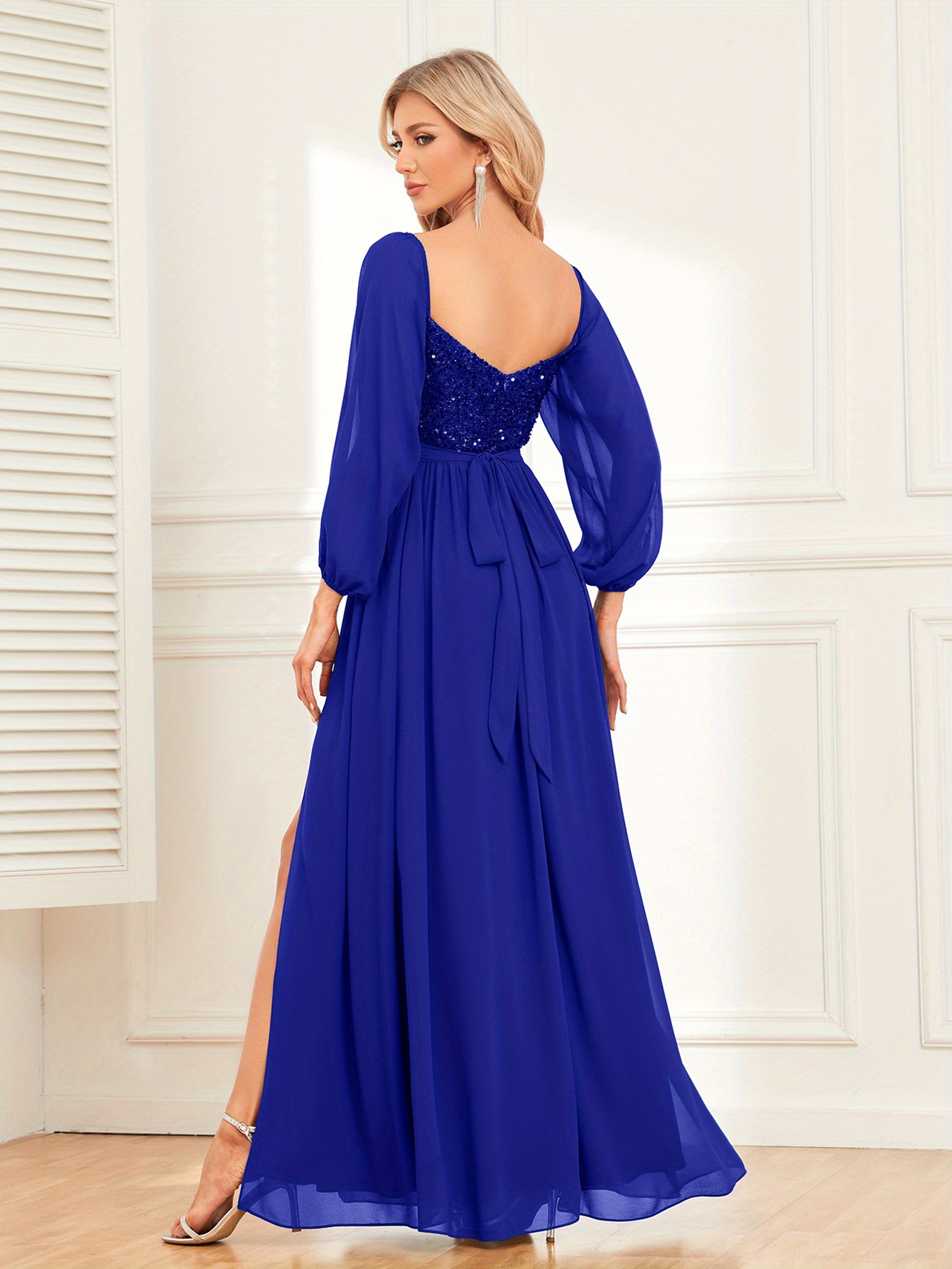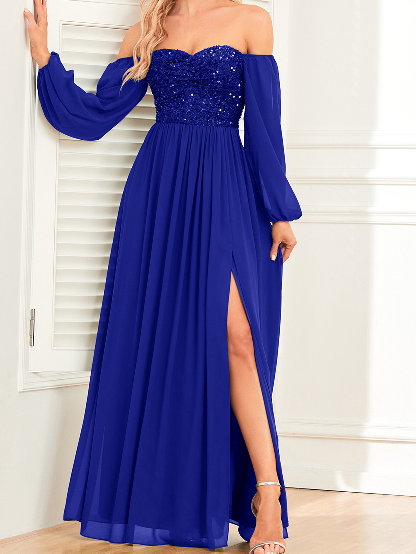 Women's Elegant Long-Sleeved Dress - Solid Color, Multi-Wear, One-Shoulder, High Slit, Tie, Fully Lined, Sequined Chiffon, Perfect for Wedding, Party, Cocktail Events